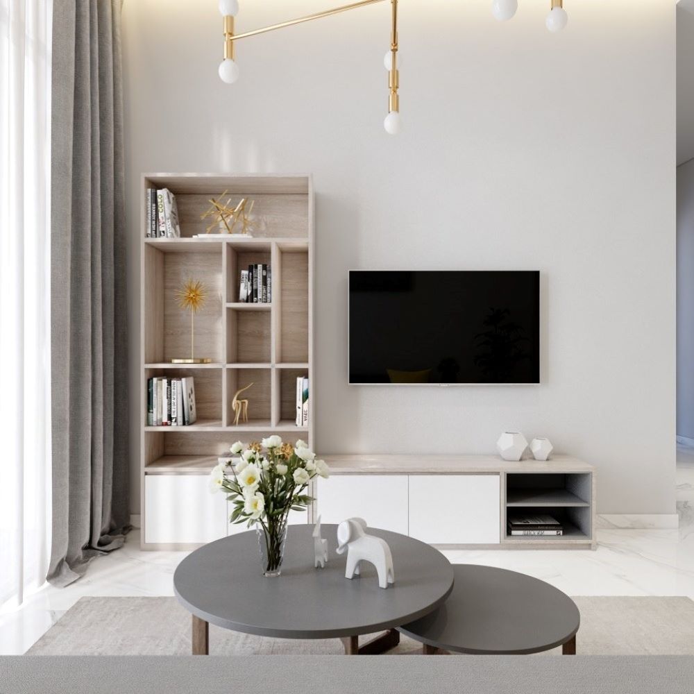 - Phòng khách: Kệ ti vi, sofa, bàn trà, tủ buffet trang trí, tủ giày dép
